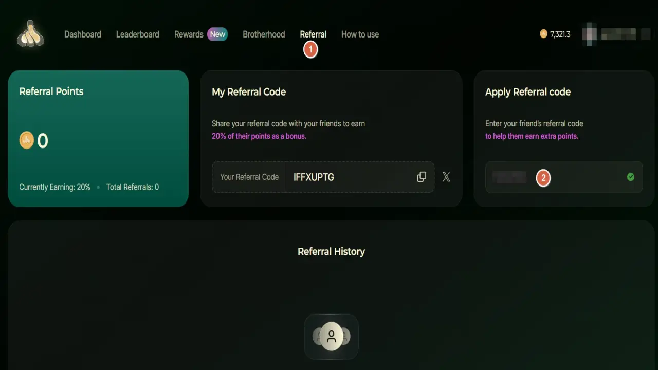 상단 메뉴 Referral ①클릭한 후, ②란에 IFFXUPTG 를 넣습니다.